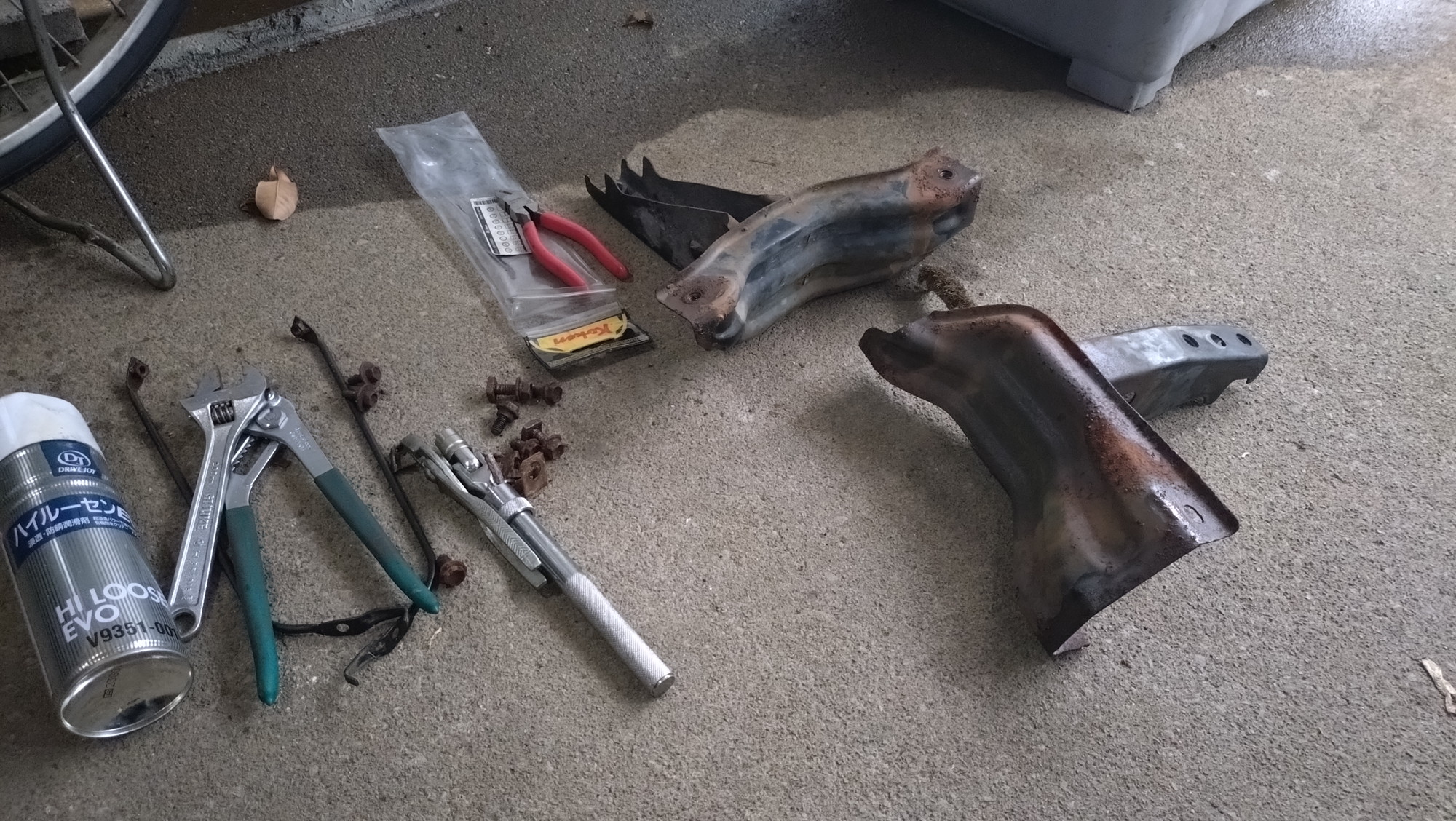 大したことはないだろうと思っていたこのような小物たちはボルトのサビが酷くて取り外しに一苦労。再使用しないので引きちぎっても良かったのですが、できれば優しくしてあげたいですからね~