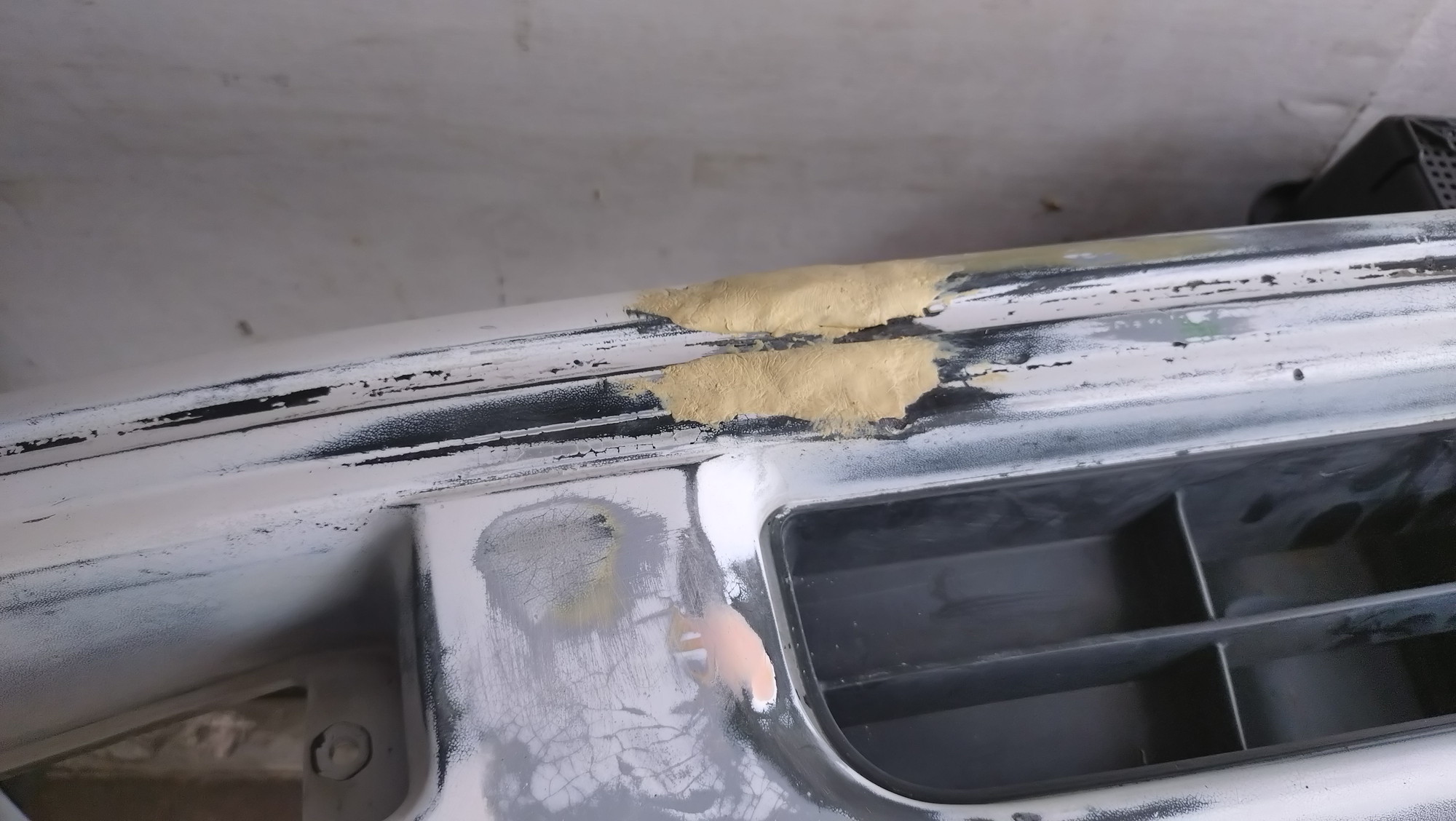 目立ってしまった凹み部に再度パテを盛ります。作業を中断してホームセンターへショッピング。使用量は少ないのでヘラを使わないで済む練るタイプのネルネルパテ。